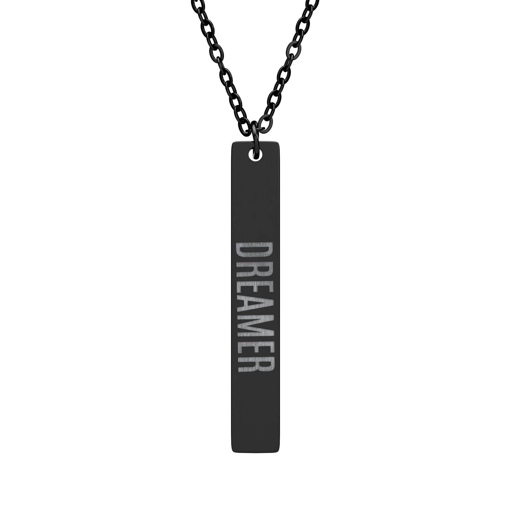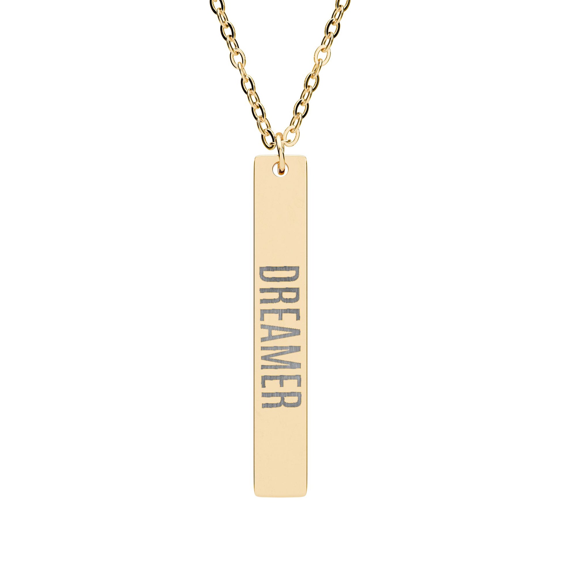 This necklace offers a polished finish for a gleaming, reflective look. Ideal for adding a subtle, yet stylish touch to any outfit, this bar necklace can be customized with engraving to make it truly unique. Letters and numbers can be added to this necklace in place of the word "Dreamer". Please leave your preferred text at checkout.
